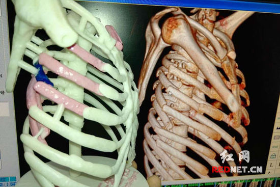 電焊工被重達(dá)數(shù)百公斤的鋼柱打中,造成7根肋骨骨折,每根肋骨斷成數(shù)截。湖南省人民醫(yī)院心胸外科采用3D打印技術(shù)確定骨折部位、明確手術(shù)切口,最終成功施行手術(shù)。國(guó)內(nèi)外文獻(xiàn)查新顯示:“未見(jiàn)3D打印技術(shù)運(yùn)用于肋骨骨折手術(shù)的報(bào)